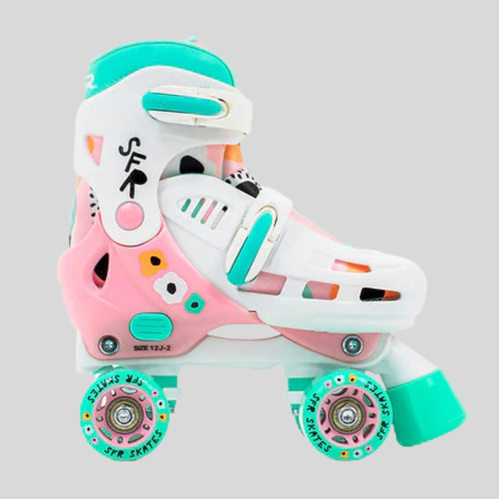 The SFR Storm V is the perfect adjustable quad skate for kids stepping into the world of roller skating. Designed with a durable hard shell and high cuff, it offers excellent support and stability for young skaters. The soft comfort-fit liner ensures a snug yet cosy feel, making learning to skate fun and comfortable. Featuring a high-impact chassis, colour-coded PP trucks, PU 54x32mm racing-style wheels, and smooth ABEC-7 bearings, the Storm V delivers a safe and exciting ride. With vibrant graphics and an adjustable fit, these skates grow with your child, providing long-lasting fun on wheels!
