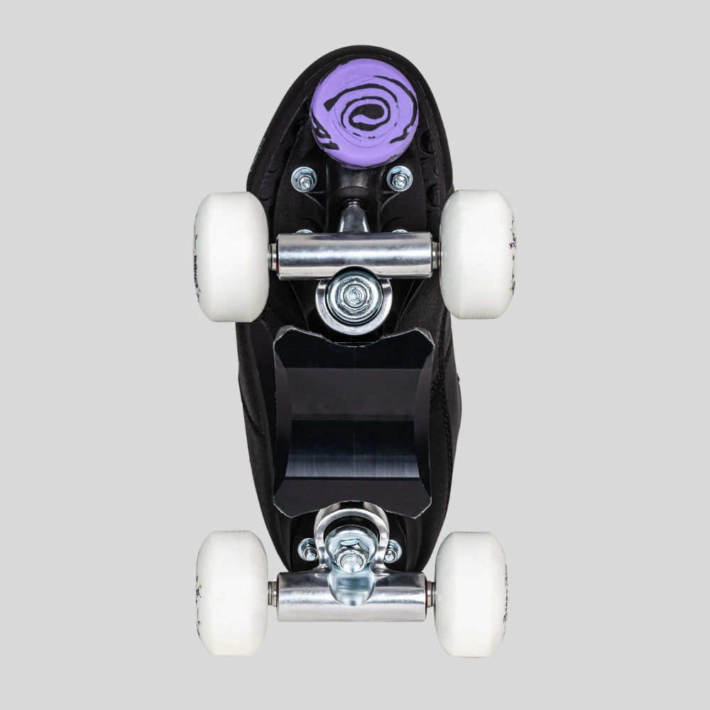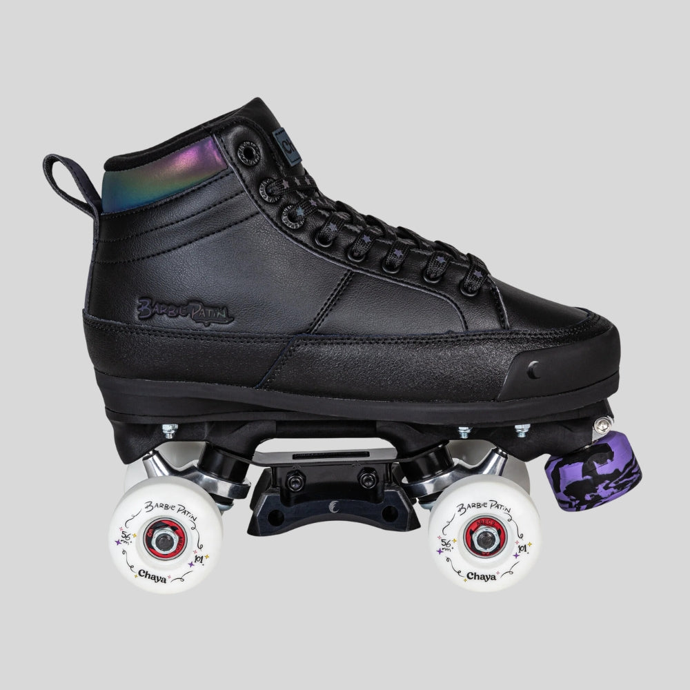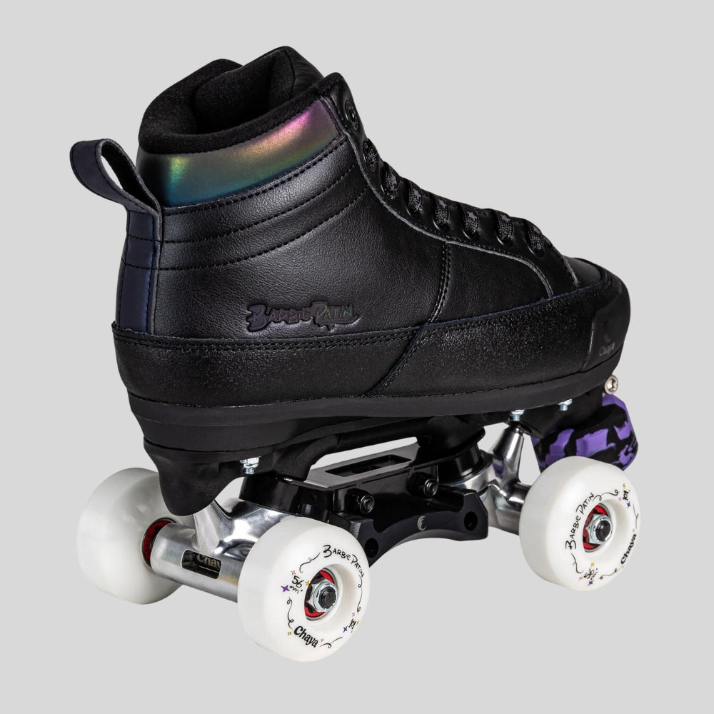 Step up your street and skatepark game with the Chaya Barbie Patin Black Kismet skates! Built for performance and style, these skates feature a reinforced construction for ultimate durability, a protective toe cap to keep them looking fresh, and the all-new Diamond Slider for smooth slides and grinds. Wider trucks offer enhanced control, while the signature 100a 56mm hard wheels with high-speed Wicked bearings deliver unmatched speed and agility. With a striking design that glows in the dark and a perfect mix of flat and heeled boot comfort, the Black Kismet is your go-to for standout style and peak performance.